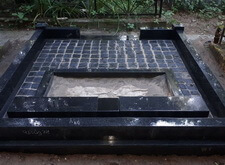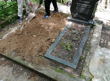 Так выглядит окончательный вариант места захоронения: памятники являются точной зеркальной копией друг друга, на землю уложена брусчатка, металлическое ограждение заменено на гранитный цоколь.